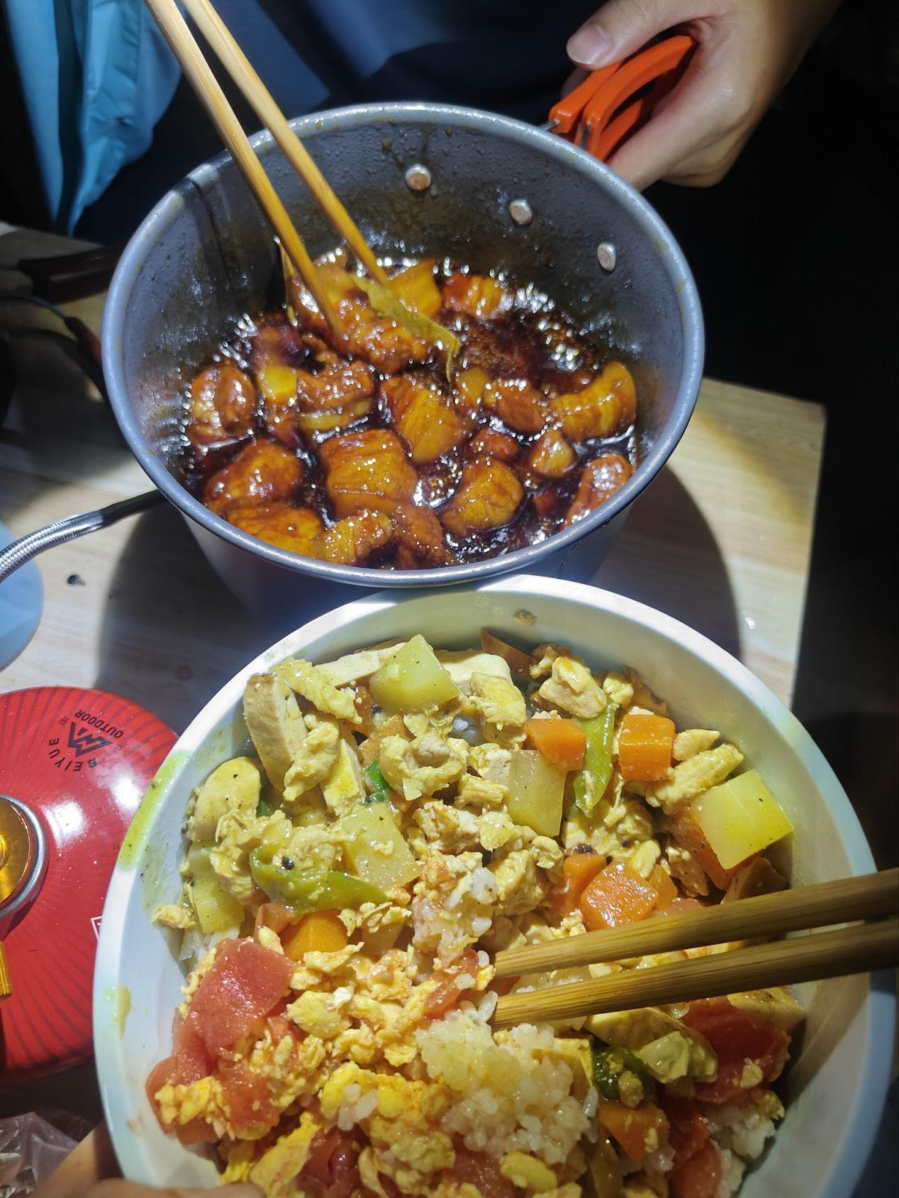 下午 4 点半抵达营地,队员们分工协作:搭帐篷、洗食材、劈柴生火,秩序井然。当晚 8 点,柴火香的大锅饭与主领烹制的秘制红烧肉上桌,众人围坐火堆用餐畅谈,疲惫渐消。10 点宵禁后,多数人安睡,守夜队员则烤着棉花糖闲聊,火光映着笑意。
